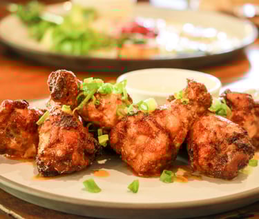 Assortiment de viandes grillées : Ribs de porc sauce barbecue, Pilons de poulets marinés, Filets mignons marinés, Chili con carne, Frites