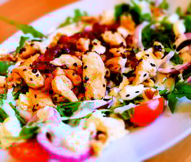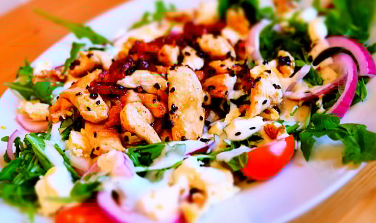 Mesclun de salade (salade mélangée), tomates, mozzarella, poulet grillé aux herbes, olives noires, croûtons 15,90€